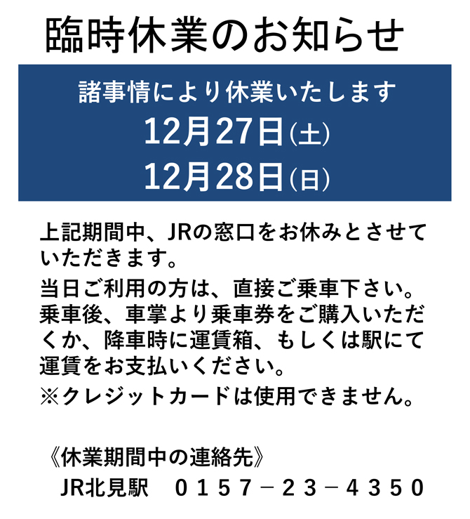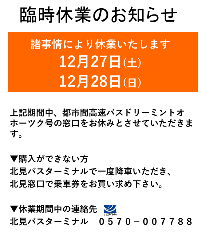 ▼事前購入ができない方 北見バスターミナルで一度降車いただき、北見窓口で乗車券をお買い求め下さい。 ▼休業期間中の連絡先 北見バスターミナル 0570-007788